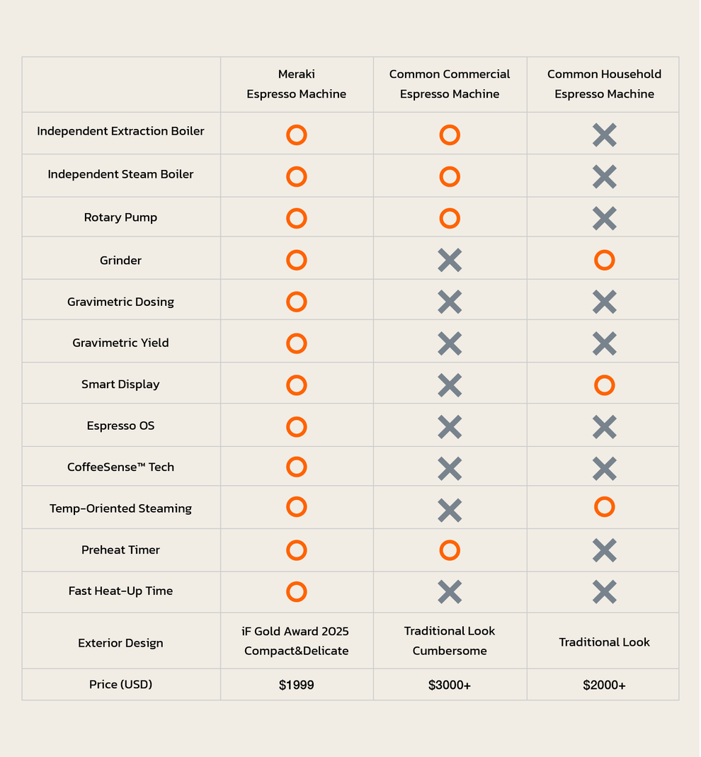 Meraki blends premium materials, minimalist aesthetics, and space-efficient design. It’s more than an espresso machine — it's a statement piece that elevates your kitchen while delivering uncompromising performance.