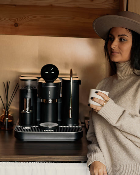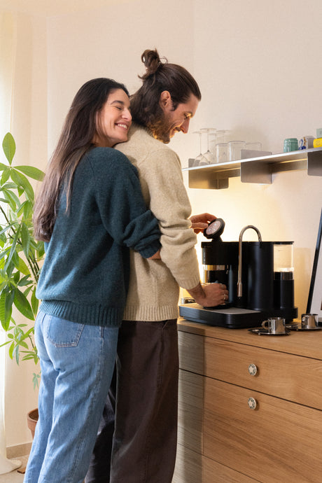 To use the CoffeeSense™ feature, simply swipe the Meraki coffee bean bag, which is equipped with an NFC chip, on the NFC area of the Meraki machine. The machine will automatically recognize the coffee beans and provide the corresponding suggested grinding and extraction parameters. On the touchscreen, tap the buttons to start the grind and extraction process. Combined with two built-in scales for grinding and extracting, the machine will automatically stop the grinding and extraction process once the desired quantity is reached.